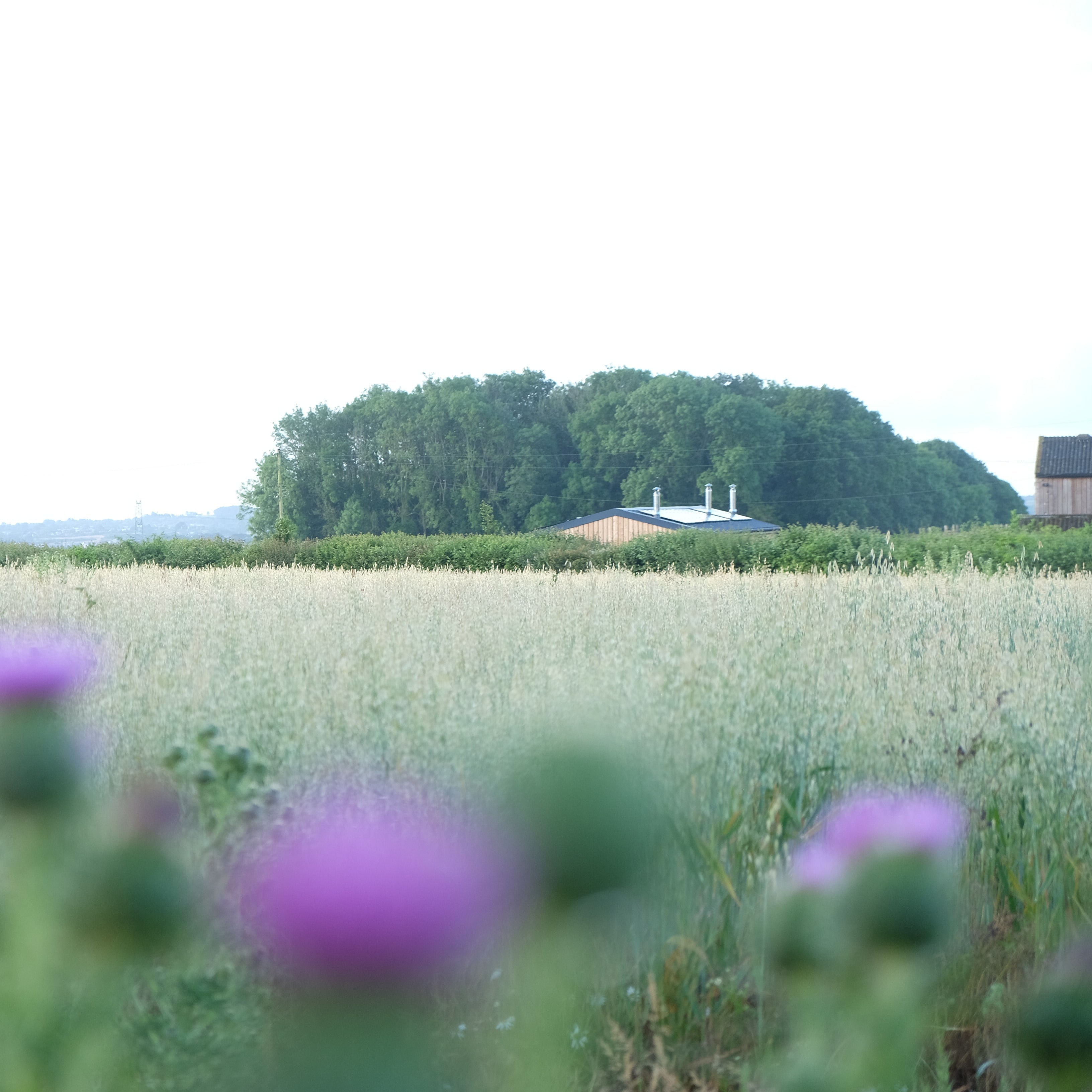moreA lone yurt looking west over a field of wildflowers to the sunset with kitchen shack and access to ancient woodland behind.