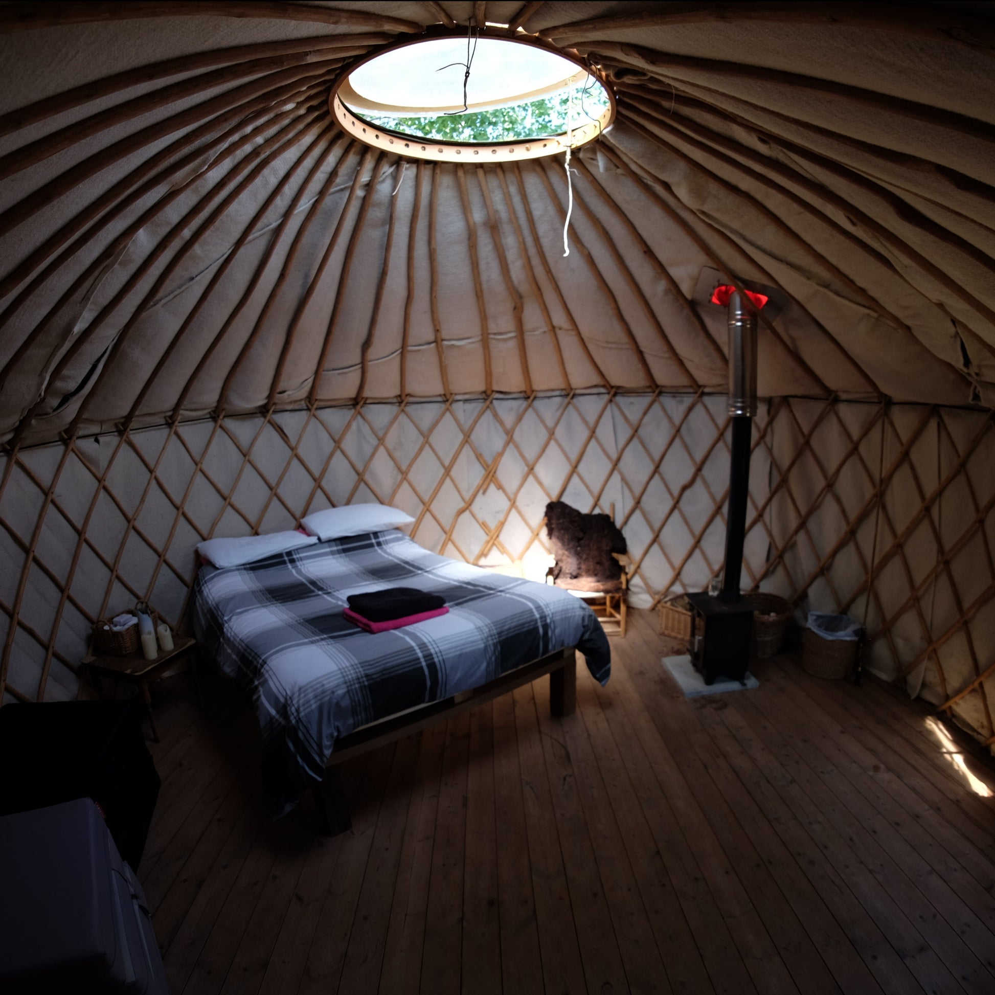 The yurt has a double bed (with linen/bedding), two single mattresses (no linen), and a wood burning stove. There is an outdoor fire pit and bbq grill. You can park within 100 metres.
